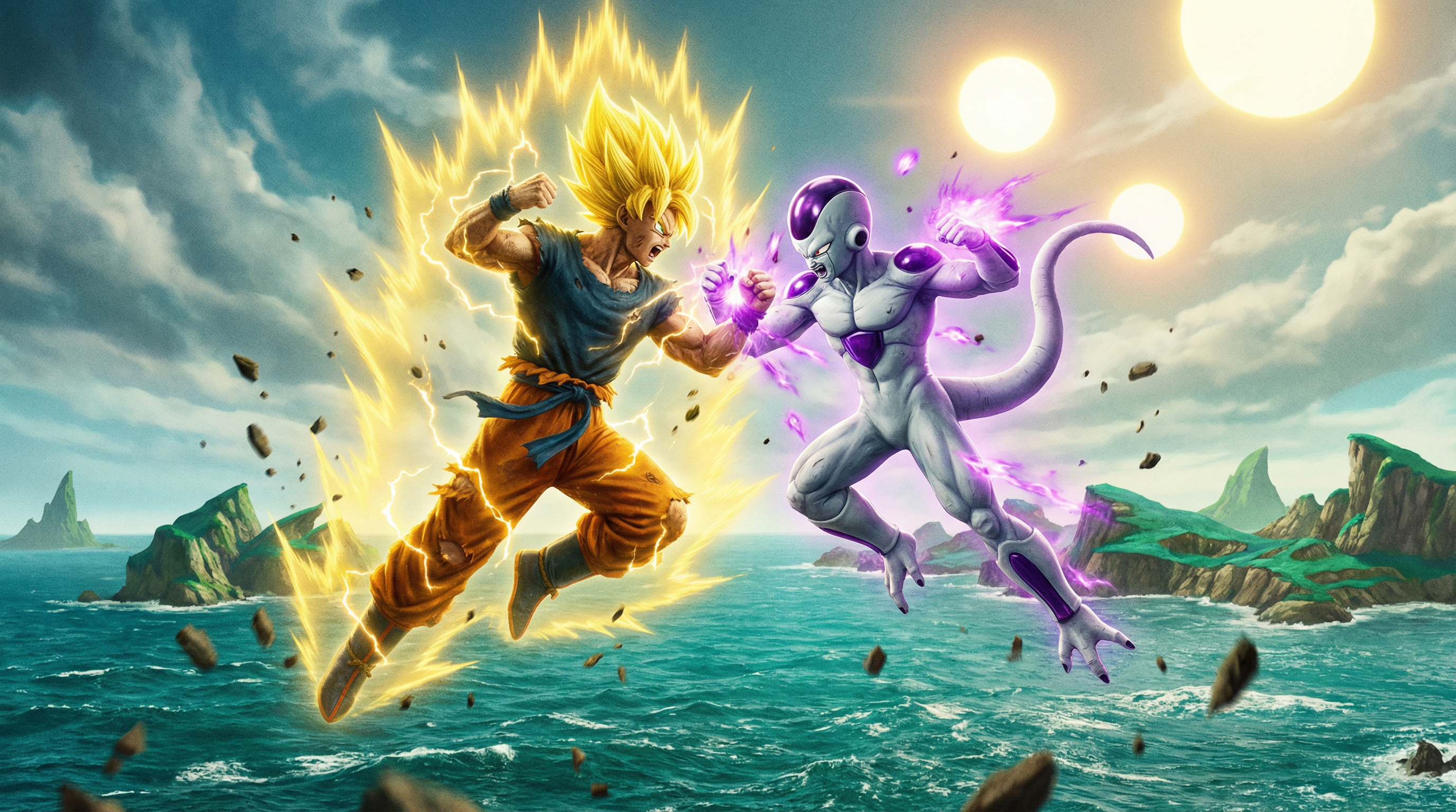 A hyper-realistic live-action cinematic battle between Son Goku and Frieza on Planet Namek. Goku is in Super Saiyan form with glowing yellow spiky hair and a vibrant golden aura. Frieza is in his final sleek white and purple form. They are engaged in high-speed aerial combat over a turquoise ocean and green alien islands.